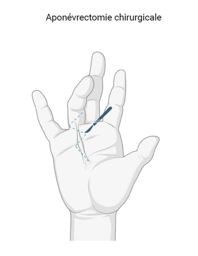 Il est indiqué dans les cas les plus complexes, c’est-à-dire en cas de rétraction importantes, ou dans certains cas de récidive. Il peut également être proposé en première intention à la place du traitement à l’aiguille. Contrairement à « l’aponévrotomie percutanée à l’aiguille », dans le traitement chirurgical, les cordes fibreuses sont complétement enlevées il s’agit d’une « aponévrectomie ». Ce traitement à l’avantage de réduire le taux de récidive mais les suites et les soins post opératoires sont plus longs. Comptez 2 à 3 semaines pour que la peau cicatrise.