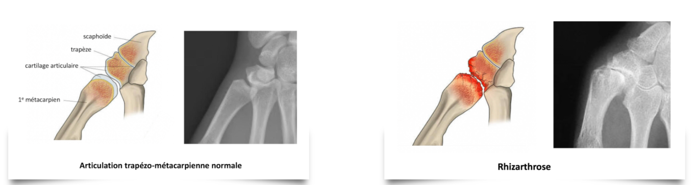 DEFINITION : La rhizarthrose est l’arthrose de la base du pouce. C’est l’usure du cartilage entre le premier métacarpien et un os appelé trapèze. Cette usure progressive est relativement fréquente et touche surtout la femme (1 femme sur 6 après 60 ans). Elle touche souvent les 2 mains. Certaines formes sont héréditaires et peuvent alors apparaître avant la cinquantaine. Il n’y a pas de relations entre l’importance de l’atteinte sur les radios et l’importance de la gêne chez le patient.